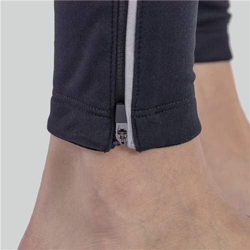 Silicon gripper at ankles keep tight in placeLocking ankle zippers.